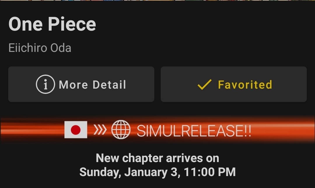 Beberapa kali juga ga ada tulisan libur eh di manga+ ada pengumuman libur. Oda sensei emang targetnya 1k chapter sebelum 2021 sih semoga aja ga libur yak